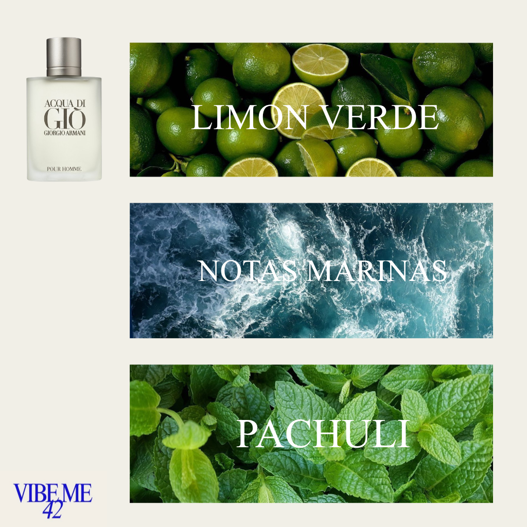 Acqua di Gio de Giorgio Armani es una fragancia de la familia olfativa Aromática Acuática para Hombres. Acqua di Gio se lanzó en 1996. Acqua di Gio fue creada por Alberto Morillas, Annick Menardo y Christian Dussoulier. Las Notas de Salida son lima, limón, bergamota, jazmín, naranja, mandarina y neroli; las Notas de Corazón son notas marinas, jazmín, calone, romero, durazno, fresia, jacinto, violeta, cilantro, rosa y nuez moscada; las Notas de Fondo son almizcle blanco, cedro, musgo de roble, pachulí y ámbar.