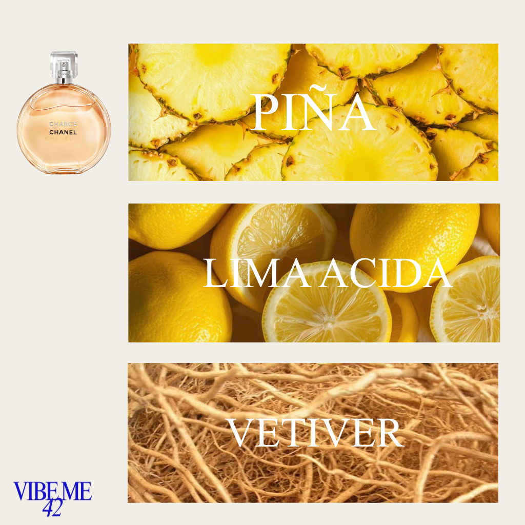 Chance Eau de Toilette de Chanel es una fragancia de la familia olfativa Chipre Floral para Mujeres. Chance Eau de Toilette se lanzó en 2002. La Nariz detrás de esta fragrancia es Jacques Polge. Las Notas de Salida son pachulí, pimienta rosa, piña, jacinto y iris; las Notas de Corazón son limón, jazmín y rosa; las Notas de Fondo son pachulí, almizcle, vetiver y vainilla.