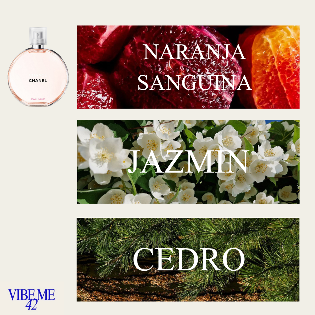 Chance Eau Vive de Chanel es una fragancia de la familia olfativa Almizcle Floral Amaderado para Mujeres. Chance Eau Vive se lanzó en 2015. La Nariz detrás de esta fragrancia es Olivier Polge. Las Notas de Salida son naranja sanguina, toronja y cítricos; las Notas de Corazón son jazmín y almizcle blanco; las Notas de Fondo son vetiver, cedro y iris.