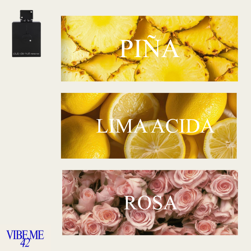 Club de Nuit Intense Man de Armaf es una fragancia de la familia olfativa Amaderada Especiada para Hombres. Club de Nuit Intense Man se lanzó en 2015. Las Notas de Salida son limón, piña, bergamota, grosellas negras y manzana; las Notas de Corazón son abedul, jazmín y rosa; las Notas de Fondo son almizcle, ámbar gris, pachulí y vainilla.