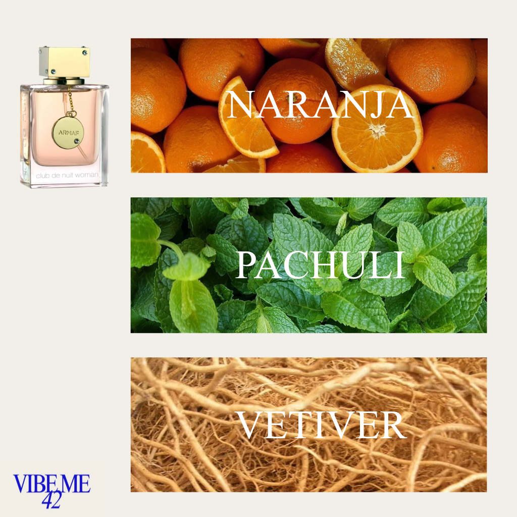 Club de Nuit Woman de Armaf es una fragancia de la familia olfativa Floral Frutal para Mujeres. Las Notas de Salida son naranja, bergamota, toronja y durazno; las Notas de Corazón son rosa, jazmín, lichi y geranio; las Notas de Fondo son pachulí, almizcle, vainilla y vetiver.