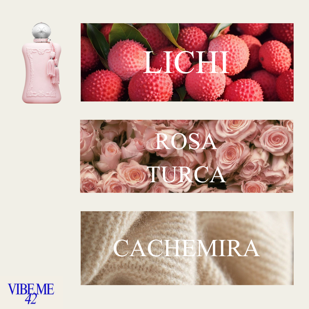 Las Notas de Salida son lichi, ruibarbo, bergamota y nuez moscada; las Notas de Corazón son rosa turca, peonía, almizcle, petalia y vainilla; las Notas de Fondo son cachemira, incienso, cedro y vetiver de Ha