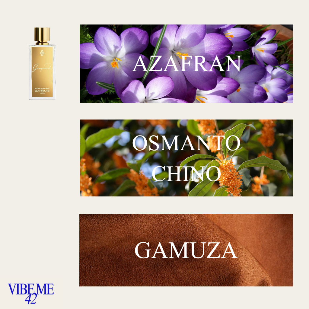 Ganymede de Marc-Antoine Barrois es una fragancia de la familia olfativa Amaderada Especiada para Hombres y Mujeres. Ganymede se lanzó en 2019. La Nariz detrás de esta fragrancia es Quentin Bisch. Las Notas de Salida son azafrán y mandarina italiana; las Notas de Corazón son osmanto chino, hojas de violeta y siempreviva; las Notas de Fondo son Notas minerales, gamuza, Akigalawood, almizcle, cedro y pachulí.
