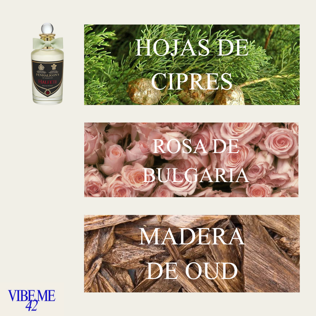 Las Notas de Salida son hojas del ciprés, azafrán, cardamomo, abrótano, bergamota y toronja (pomelo); las Notas de Corazón son rosa de Bulgaria (rosa Damascena de Bulgaria), nuez moscada y jazmín; las Notas de Fondo son madera de oud, cedro, cuero, sándalo, ámbar, haba tonka, vainilla y almizcle