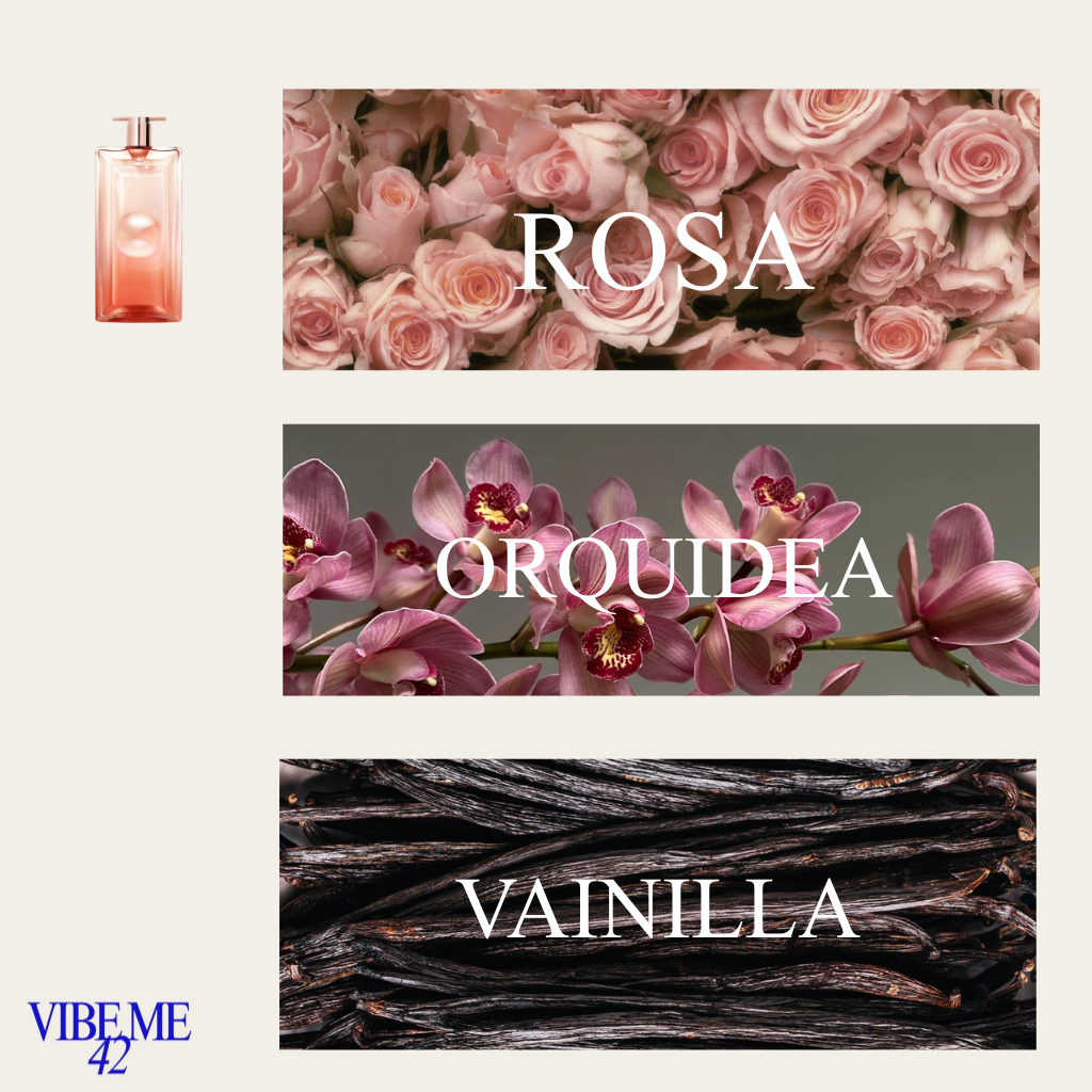 La Nota de Salida es rosa; la Nota de Corazón es orquídea; la Nota de Fondo es vainilla.