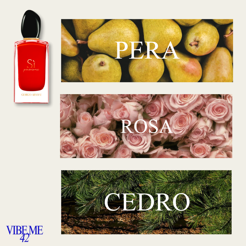 Sì Passione de Giorgio Armani es una fragancia de la familia olfativa Floral Frutal para Mujeres. Sì Passione se lanzó en 2017. Sì Passione fue creada por Christine Nagel y Julie Massé. Las Notas de Salida son pera, grosellas negras, pimienta rosa y toronja; las Notas de Corazón son piña, rosa, jazmín y heliotropo; las Notas de Fondo son vainilla, cedro, pachulí y Amberwood.