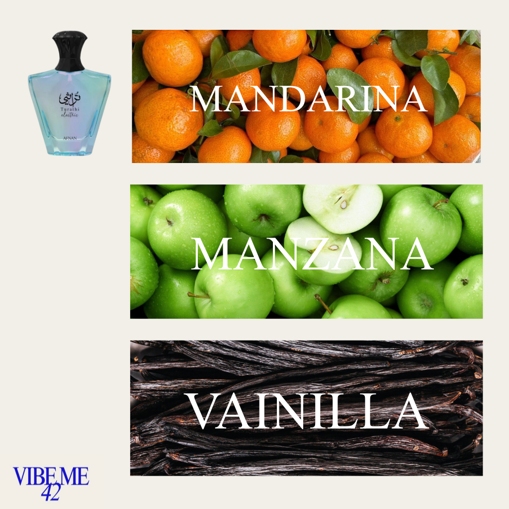Las Notas de Salida son pera, mandarina, toronja rosada y bergamota; las Notas de Corazón son flor de azahar del naranjo, manzana y cedro; las Notas de Fondo son almizcle, ámbar y vainilla.